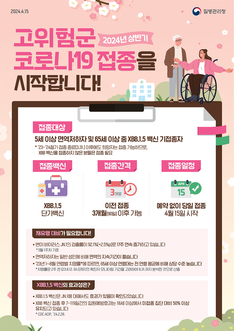 질병청은 앞서 지난달 22일 현재 유행하는 변이(JN.1)에 대한 백신의 효과성, 면역저하자 등 고위험군의 짧은 면역 지속 기간 등을 고려해 올해 상반기 코로나19 접종계획을 발표한 바 있다.